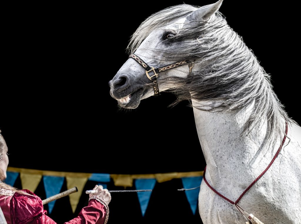 A man is called up to participate in a stage act and is prompted to act more like a horse…